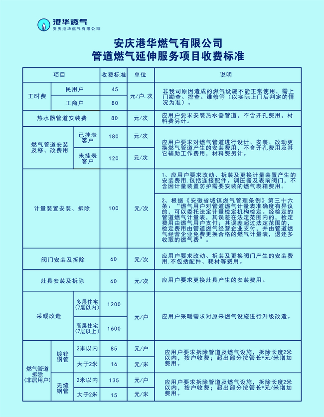 隨著安慶城市燃氣建設(shè)的快速發(fā)展,人民群眾生活水平的提高,在保障了用戶基本用氣需求的前提下,燃氣用戶對管道燃氣的延伸服務(wù)有了更多更高的要求。為滿足用戶的個性化需求,我司按照“國辦函〔2020〕129號”文件精神,結(jié)合實際情況和市場同類服務(wù)標(biāo)準(zhǔn),按照用戶自愿、有償服務(wù)、合理收益、便于操作的原則,制定了以下延伸服務(wù)收費標(biāo)準(zhǔn),定于2021年9月6日起執(zhí)行。