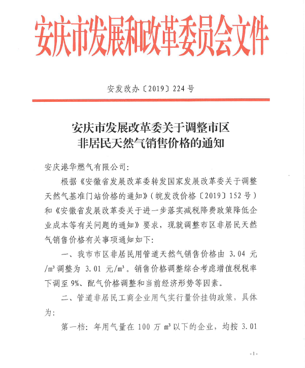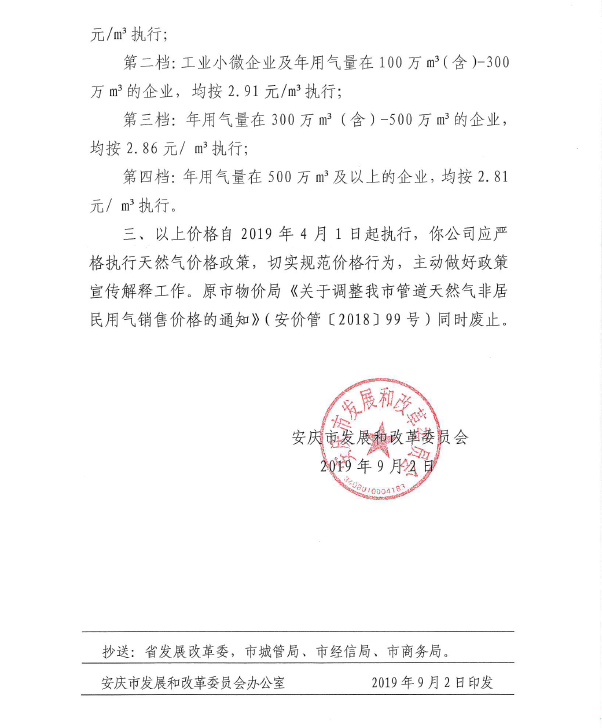 安慶市發(fā)展改革委關(guān)于調(diào)整市區(qū)非居民天然氣銷(xiāo)售價(jià)格的通知(2019)