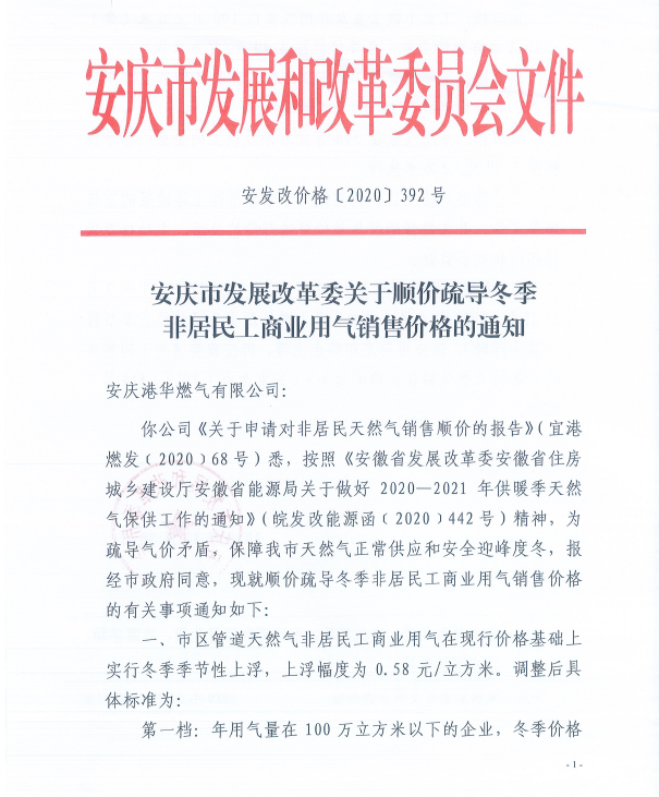 安慶市發(fā)展改革委關(guān)于順價疏導(dǎo)冬季非居民工商業(yè)用氣價格的通知(2020)