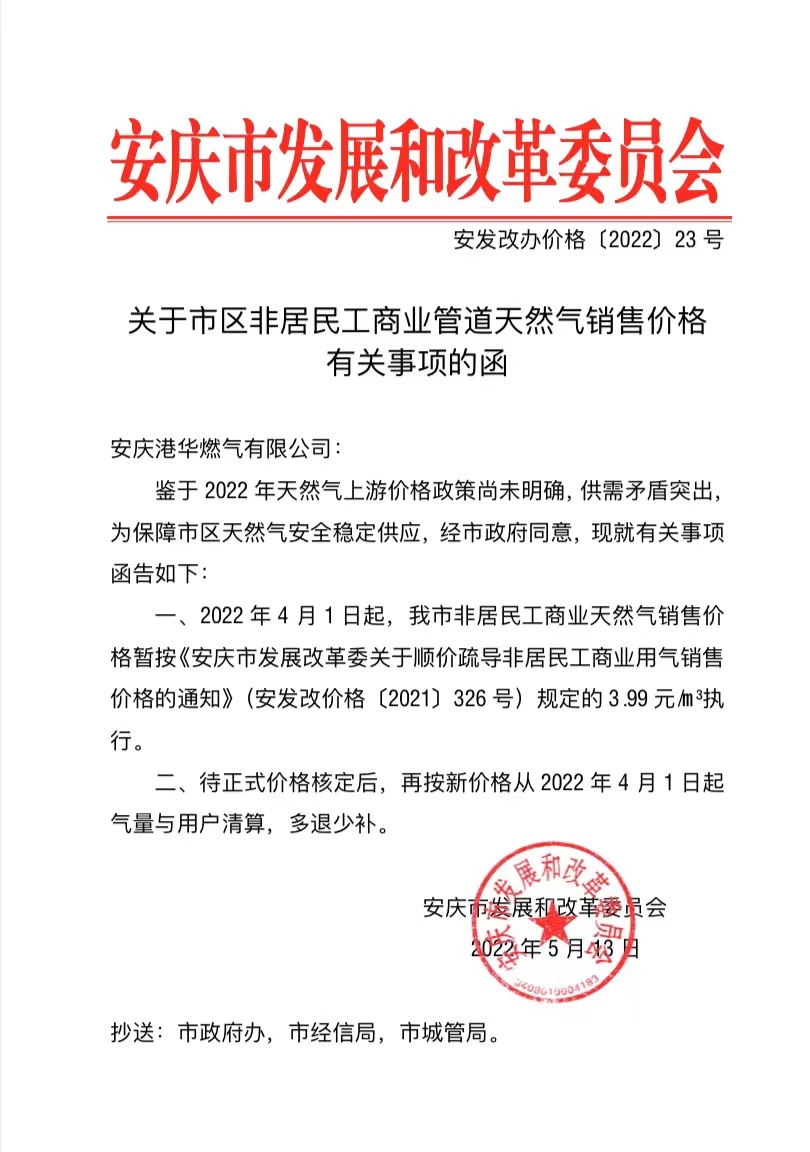 關(guān)于市區(qū)非居民工商業(yè)管道天然氣銷售價格有關(guān)事項的函(安發(fā)改辦價格〔2022〕23號)