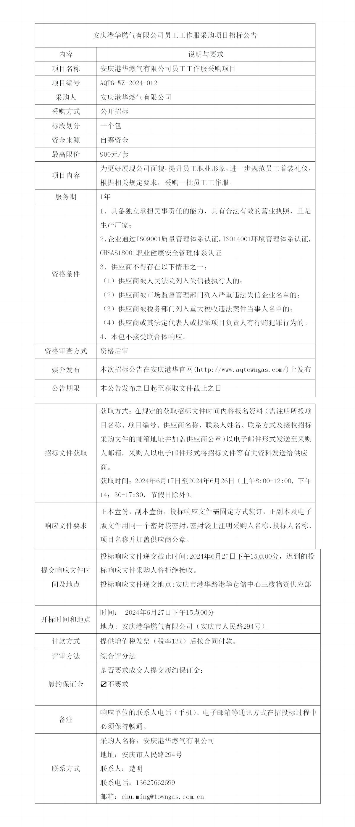 安慶港華燃?xì)庥邢薰締T工工作服采購項目招標(biāo)公告