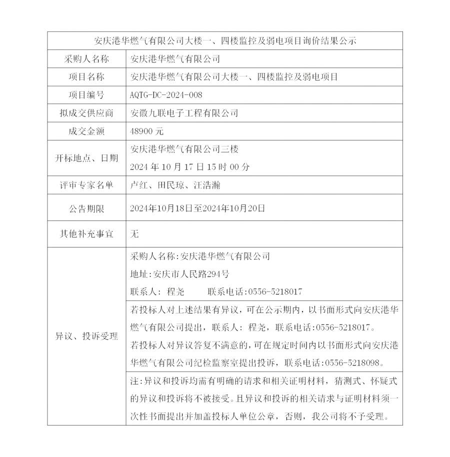 安慶港華燃氣有限公司大樓一、四樓監(jiān)控及弱電項目詢價結(jié)果公示