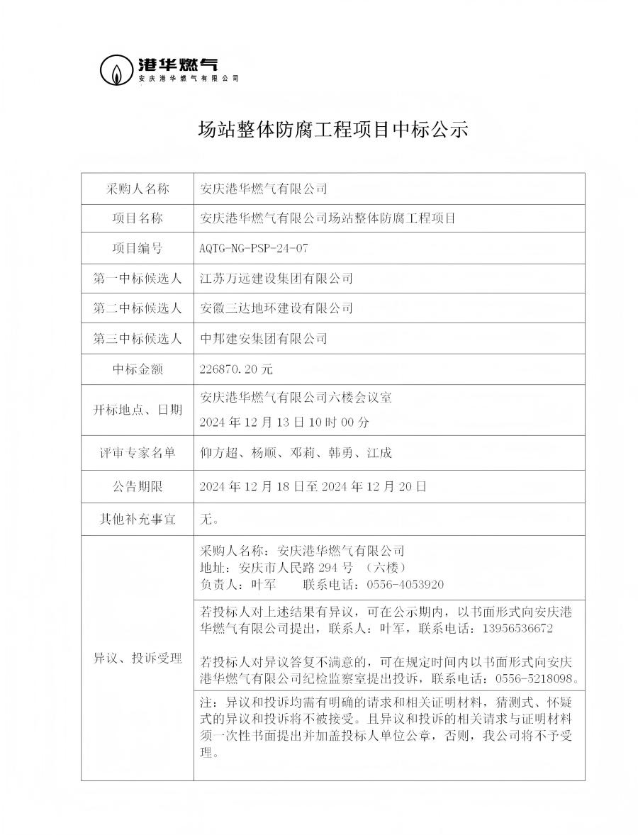 場站整體防腐工程項(xiàng)目中標(biāo)公示