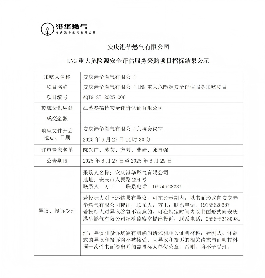 安慶港華燃?xì)庥邢薰綥NG重大危險(xiǎn)源安全評(píng)估服務(wù)采購項(xiàng)目招標(biāo)結(jié)果公示