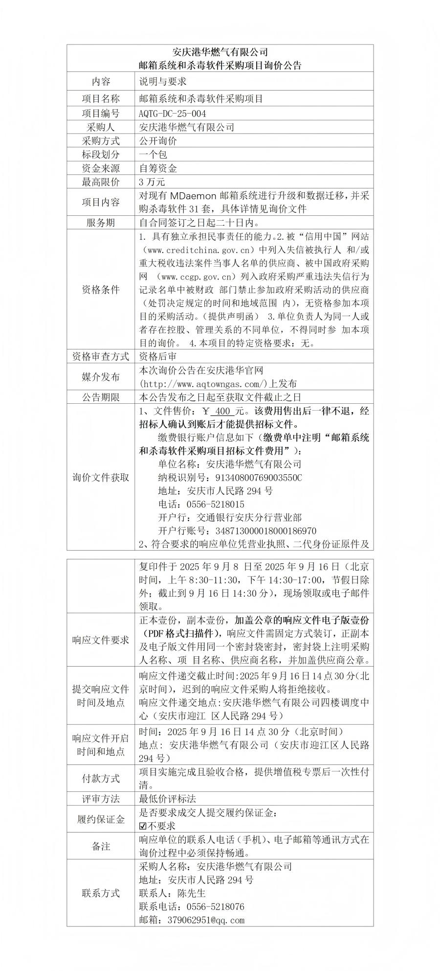 安慶港華燃?xì)庥邢薰距]箱系統(tǒng)和殺毒軟件采購項目詢價公告 發(fā)布時間:2025-09-08    閱讀次數(shù):894次