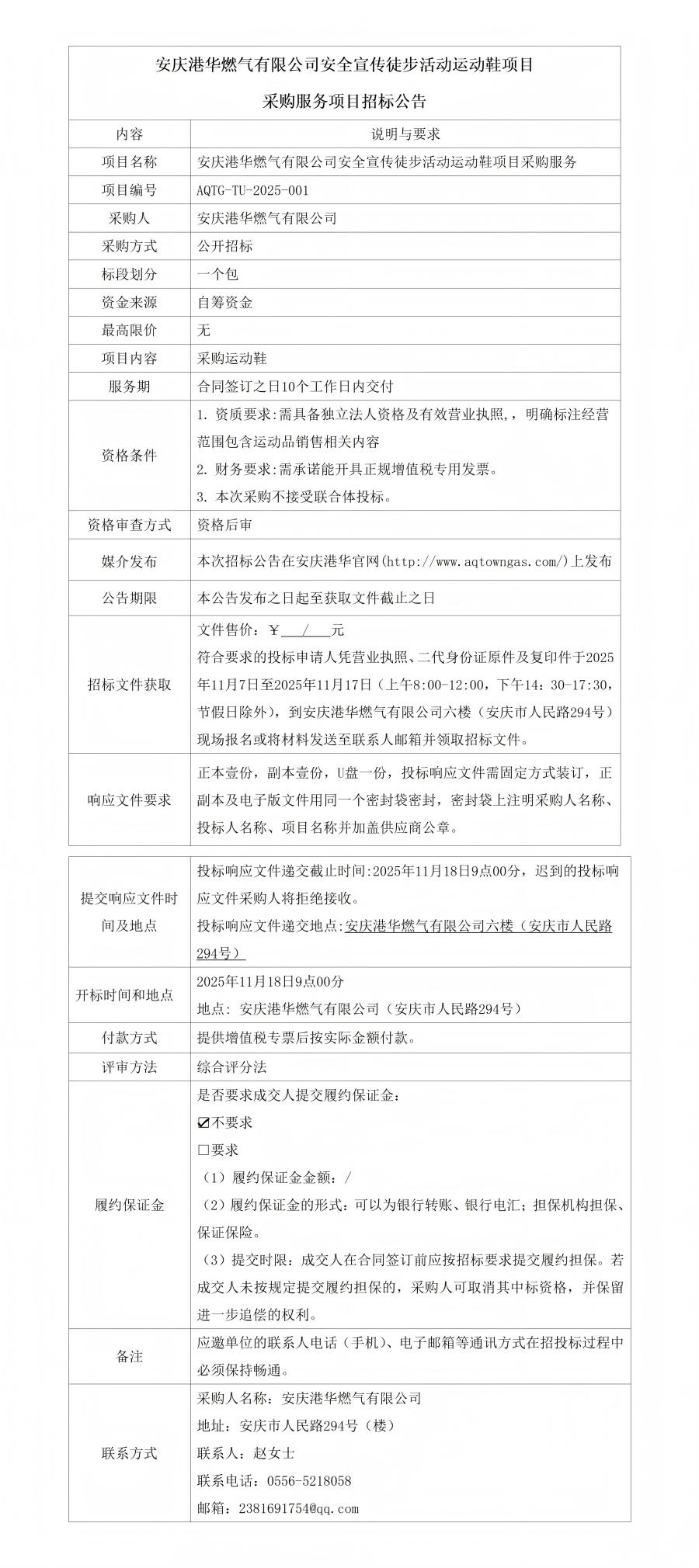安慶港華燃氣有限公司安全宣傳徒步活動運動鞋項目采購服務項目招標公告 發(fā)布時間:2025-11-07    閱讀次數:494次