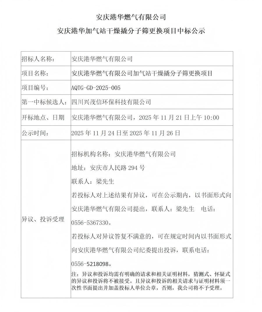 安慶港華燃?xì)庥邢薰景矐c港華加氣站干燥撬分子篩更換項目中標(biāo)公示 發(fā)布時間:2025-11-24    閱讀次數(shù):263次