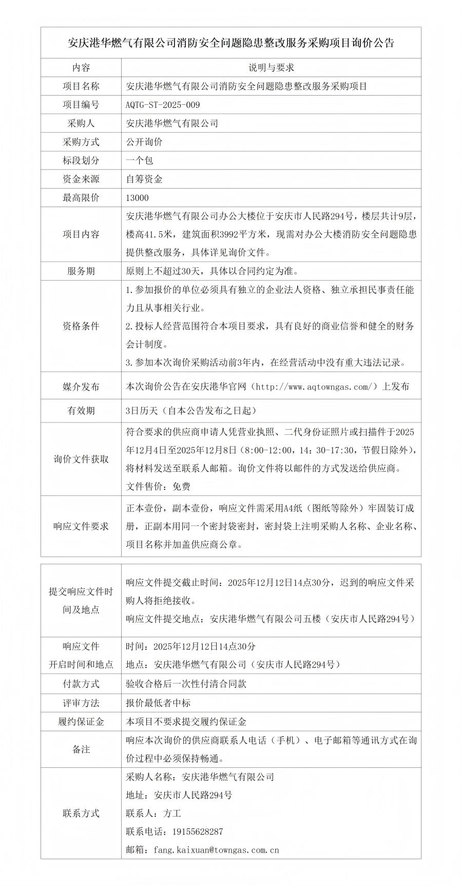 安慶港華燃?xì)庥邢薰鞠腊踩珕栴}隱患整改服務(wù)采購(gòu)項(xiàng)目詢價(jià)公告
