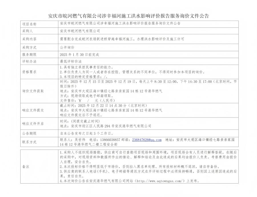 安慶市皖河燃?xì)庥邢薰旧嫘粮:邮┕ず樗绊懺u價報告服務(wù)詢價文件公告 發(fā)布時間:2025-12-15    閱讀次數(shù):218次