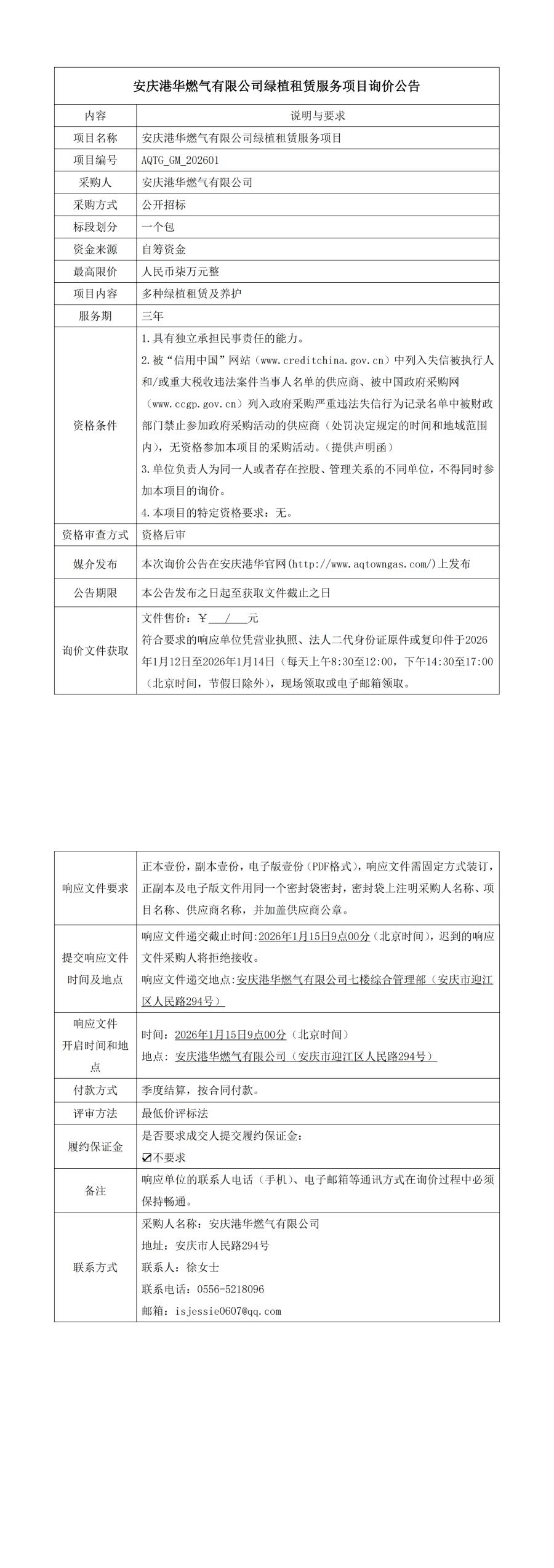 安慶港華燃氣有限公司綠植租賃服務項目詢價公告